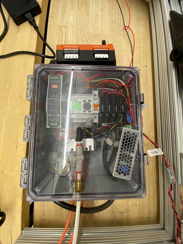 For a first pass control system, I hacked together an off the shelf PLC, a handful of SSRs to make an H Bridge, a 4/2 pneumatic air valve, and a knock-off crane controller from China. The end result is a wirelessly controllable robot with a pneumatically actuated piston.